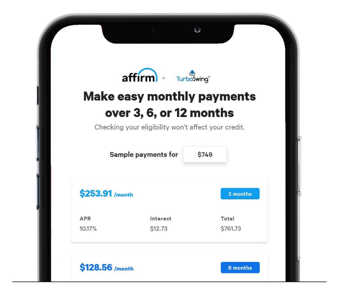TurboSwing has partnered with Affirm to give you a simple way to make your purchase with no hidden fees.